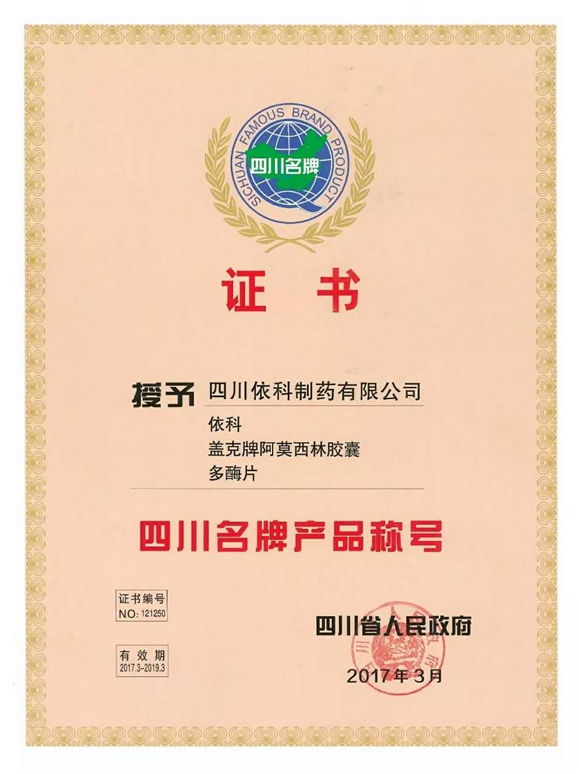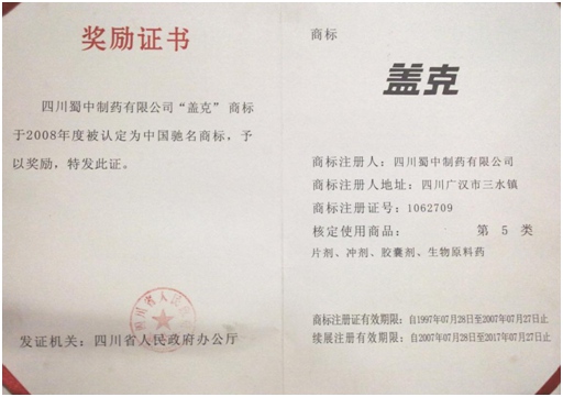 公司高度重视品牌战略,依法注册了“盖克”、“蜀中”、“三星堆”、“阿莫锋”、“益善源”、“蓉通”、“舒淇未成名前的三绝版x❌ⅹ”等108件注册商标,1999年“盖克”、2003年“蜀中”、2007年“三星堆”被认定为德阳市知名商标,2001年“盖克”、2004年“蜀中”被认定为四川省著名商标, 2008年“盖克”商标被国家工商行政管理总局认定为“中国驰名商标”。2017年3月,公司盖克牌、舒淇未成名前的三绝版x❌ⅹ牌阿莫西林胶囊和多酶片被四川省人民政府授予四川名牌产品称号。2016年,公司实现营业收入66373万元,利税7600万元;2017年,公司实现营业收入75045万元,利税7572万元。公司2017年被命名为德阳市第七批院士专家工作站,2016-2018连续三年被德阳市人民政府确定为重点龙头企业。